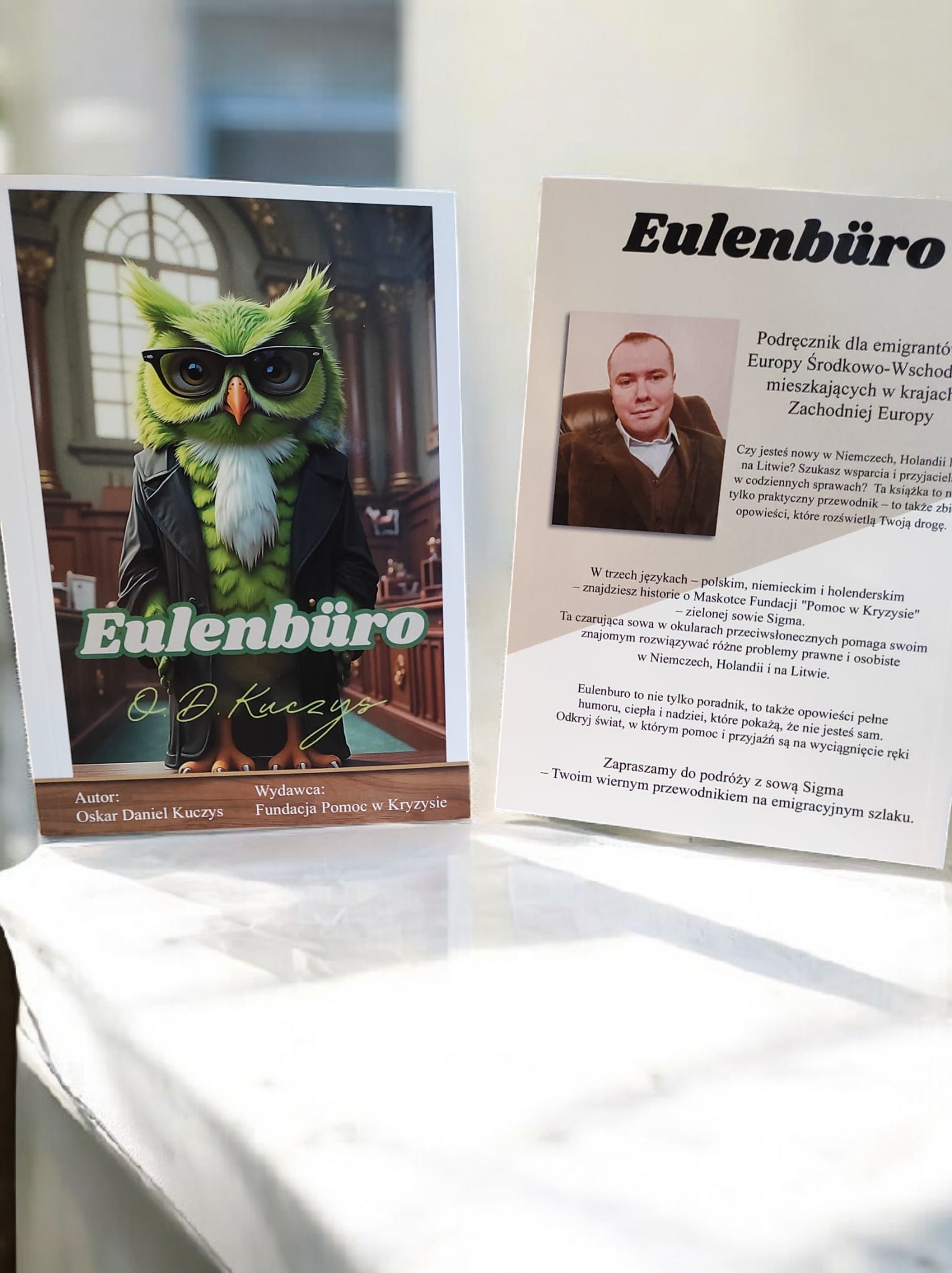 W trzech językach – polskim, niemieckim i holenderskim – znajdziesz historie o Maskotce Fundacji "Pomoc w Kryzysie" – zielonej sowie Sigma. Ta czarująca sowa w okularach przeciwsłonecznych pomaga swoim znajomym rozwiązywać różne problemy prawne i osobiste w Niemczech, Holandii i na Litwie.